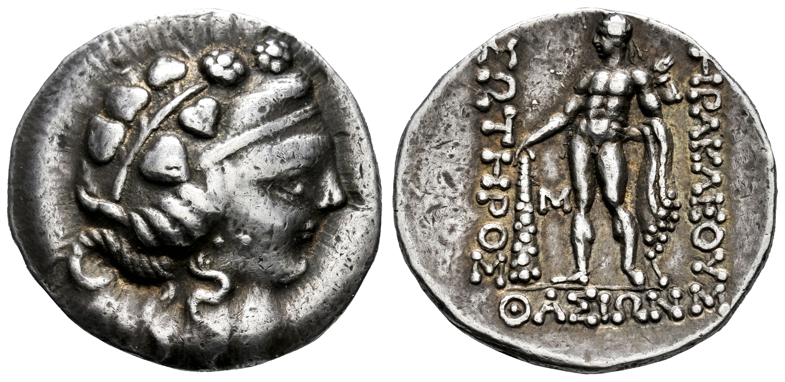Thrace Islands. Thasos. Tetradrachm. 2nd-1st centuries BC. "Imitative Series". (Göbl-OTA pl. 46, class II). (Prokopov-Group XII, 836. VAF4-R464). (Lanz-963/6). Anv.: Head of Dionysos to right, wearing ivy wreath. Rev.: Herakles standing to left, holding club and lion skin; HPAKΛEOVΣ to right, ΣΩTHPOΣ to left, MH monogram to inner left, ΘAΣIΩN below. Ag. 16,85 g. Lightly toned. Choice VF. Est...350,00.