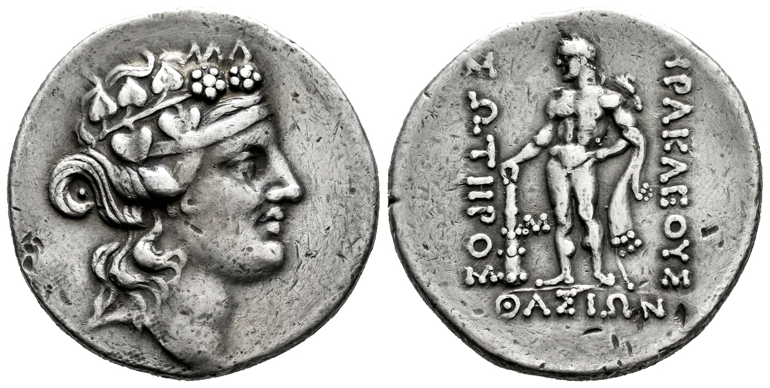 Thrace Islands. Thasos. Tetradrachm. 168/7-148 BC. (Le Rider-Thasiennes 51). (Sng Cop-1039). (Bmc-72). Anv.: Head of young Dionysos to right, wearing ivy wreath. Rev.: HPAKΛEOYΣ ΣΩTHPOΣ, Herakles standing to left, holding club and lion skin; M to inner left, ΘAΣIΩN below. Ag. 16,86 g. Minor nicks. Choice VF/VF. Est...300,00.