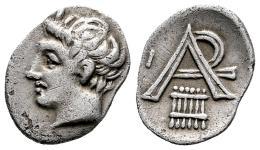 Arkadia. Obol. 330-275 BC. Megalopolis. (Bcd-Peloponnesos 1525). (Hgc-5, 930). Anv.: Horned head of Pan left; I to right. Rev.: League monogram above syrinx; I to left. Ag. 0,84 g. Ex Künker 16 (27/03/2013), lot 39; Ex Gerhard Hirsch 255 (14/02/2008), lot 1504. Choice VF. Est...140,00.