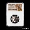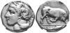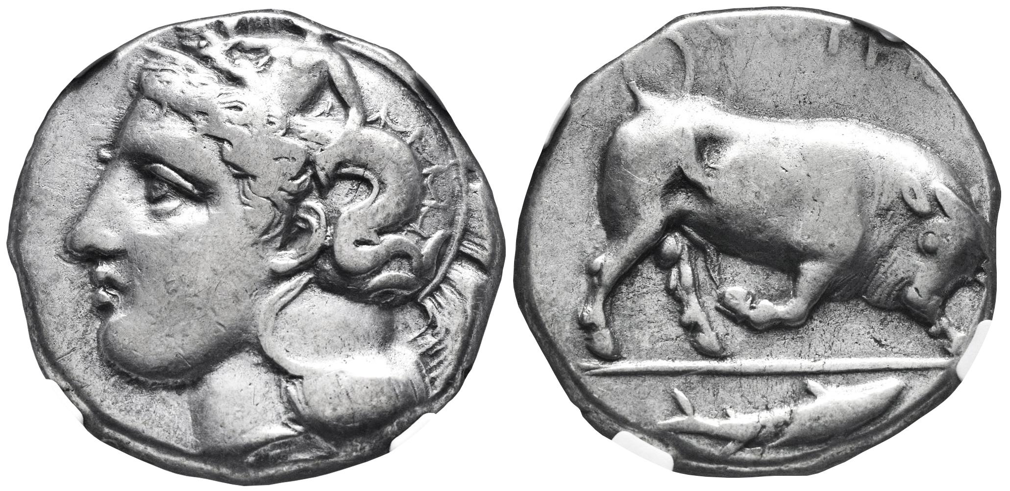 Lucania. Thourioi. Distater. 400-350 BC. (HN Italy-1804). (Sng Ans-960). (Hgc-1, 1256). Anv.: Head of Athena to left, wearing crested Attic helmet adorned, on the bowl, with Skylla raising her right hand as if to shade her eyes as she looks off in the distance. Rev.: ΘΟΥΡΙΩΝ Bull butting to right; in exergue, fish to right. Ag. 15,60 g. Slabbed by NGC as VF, Strike 4/5, Surface 3/5. Fine Style. NGC-VF. Est...2000,00.