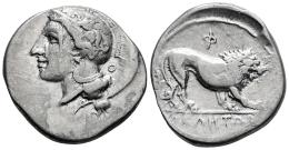 Lucania. Velia. Nomos. 340-334 BC. Theta group. (Williams-Period V, 263.IB (O151/R203)). (HN Italy-1284). (SNG Ans-1294). Anv.: Head of Athena to left, wearing crested Phrygian helmet, decorated with centauress; monogram of Θ behind. Rev.: Lion tearing at prey to left; Φ above, YEΛHTΩN in exergue . Ag. 7,48 g. Ex Classical Numismatic Group 562 (15/05/2024), lot 18. Included original label. VF/Choice VF. Est...250,00.
