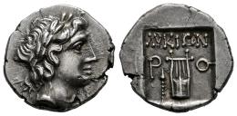 Lycia. Rhodiapolis. Drachm. 167-81 BC. (Troxell-62, 40). (Sng Cop-132). (Bmc-1). Anv.: Laureate head of Apollo right; bow and quiver over shoulder. Rev.: P-O flanking kithara, ΛVKIΩΝ above, lance to left; all within shallow incuse square . Ag. 2,70 g. Lightly toned. Extremely rare. XF. Est...250,00.