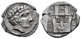 Macedon. Chalkidian League. Tetrobol. 415-410 BC. Olynthos. (Robinson & Clement-Group B, 11 (A10)). (Sng Ans-514). (Hgc-3.1, 5.2). Anv.: Laureate head of Apollo to right; pelleted circular border around. Rev.: Kithara, XAΛKIΔEΩN around; all shallow within incuse square. Ag. 2,38 g. Ex Cayón (14/12/2005), lot 66. Choice VF. Est...400,00.