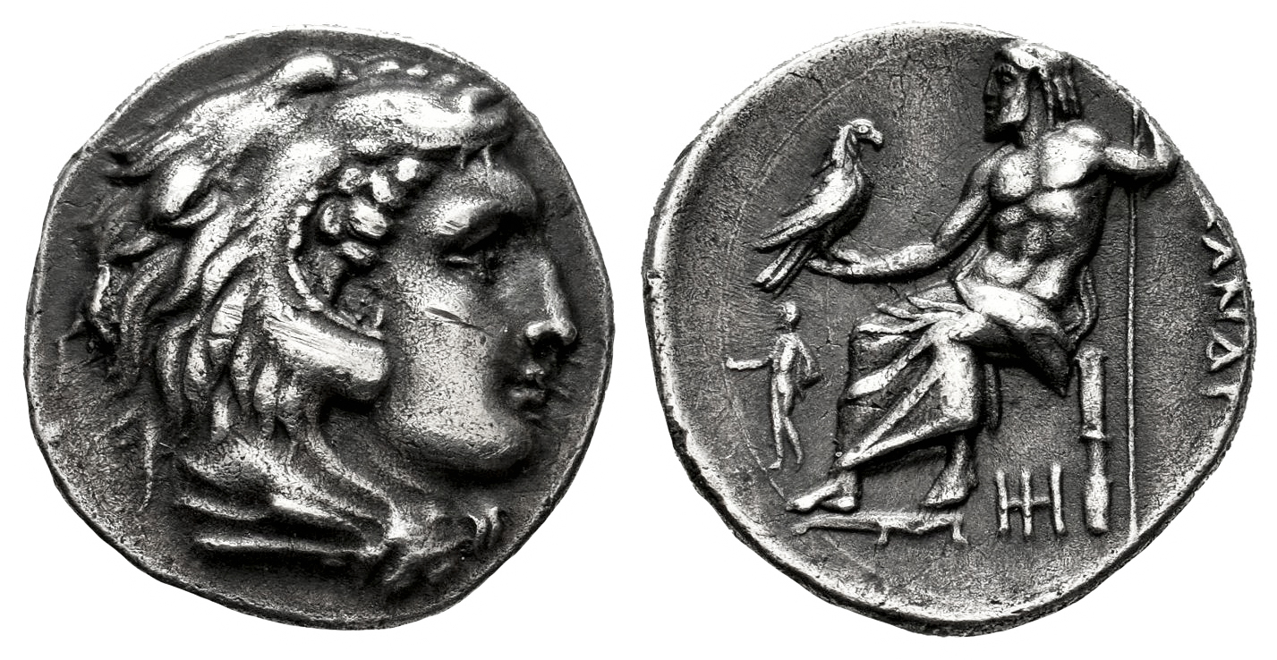Kingdom of Macedon. Alexander III, "The Great". Drachm. 328-323 BC. Abydos. (Price-1501). (Müller-906). (Sng Cop-892). Anv.: Head of Herakles to right, wearing lion skin headdress. Rev.: Zeus Aëtophoros seated to left, holding sceptre; (AΛEΞ)ANΔP(OY) to right, male figure standing to left in left field, monogram below throne . Ag. 4,16 g. Scratch on the cheek. Slight patina. Choice VF. Est...150,00.