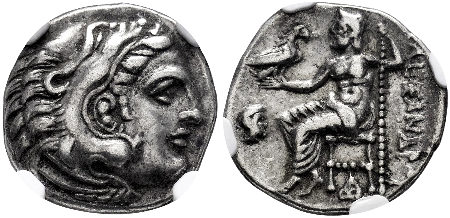 Kingdom of Macedon. Antigonos I Monophthalmos. Drachm. 310-301 BC. Abydos. Struck as Strategos or king of Asia, in the name and types of Alexander III. (Price-1551). (Müller-189). Anv.: Head of Herakles to right, wearing lion skin headdress. Rev.: Zeus Aëtophoros seated to left, holding sceptre; ΑΛEΞANΔPOY to right, head of Ammon to right in left field, ivy-leaf below throne. Ag. Slabbed by NGC as Ch VF. Est...180,00.