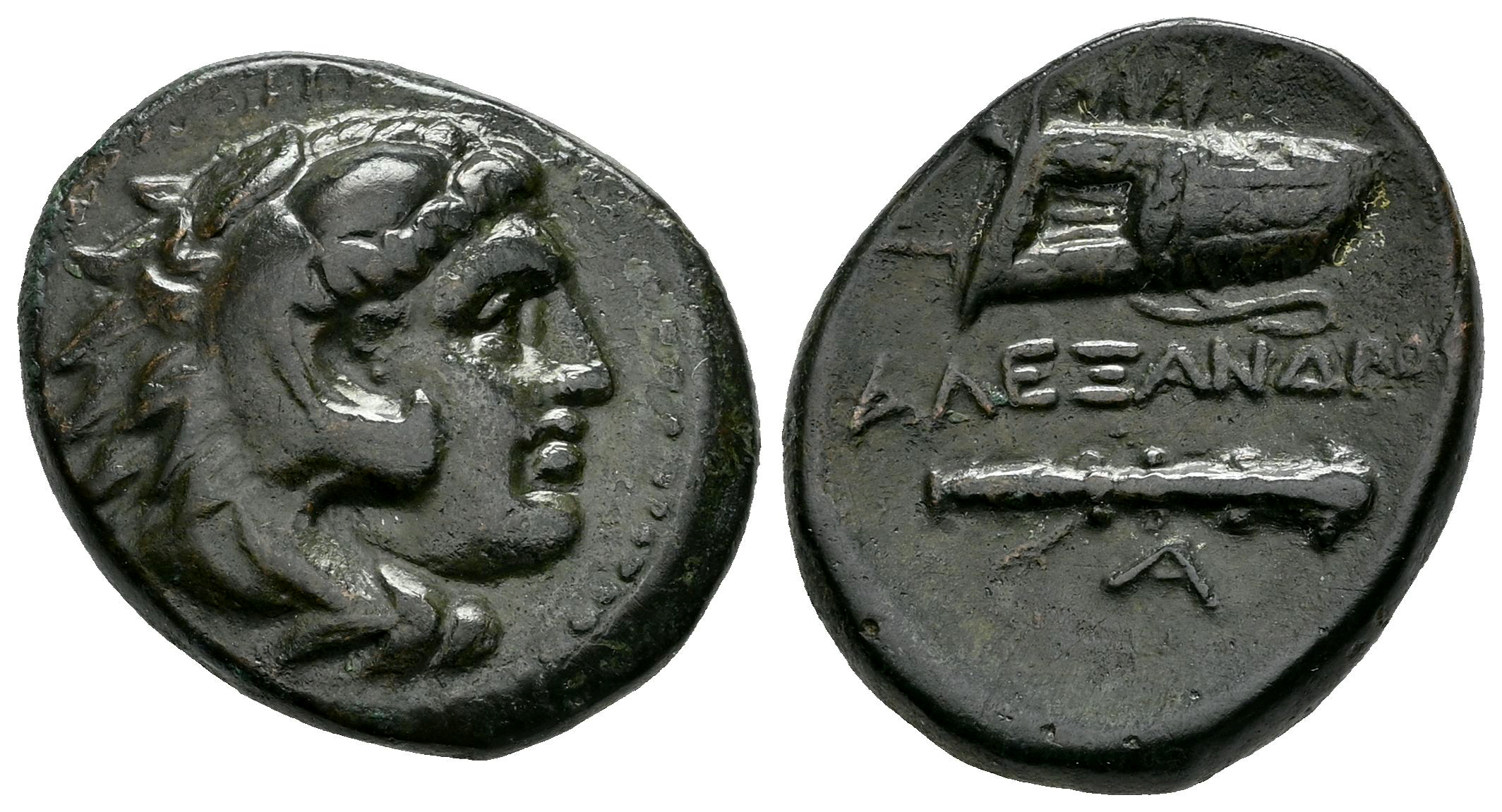 Kingdom of Macedon. Alexander III, "The Great". AE 19. 336-323 BC. Uncertain mint in Macedon. (Price-332). Anv.: Head of Herakles to right, wearing lion skin headdress. Rev.: Bow in bow-case above club, ΑΛΕΞΑΝΔΡΟΥ between; A below. Ae. 5,22 g. A good sample. Choice VF. Est...70,00.