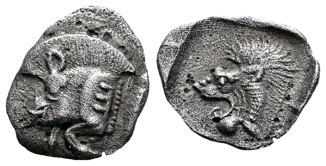 Mysia. Kyzikos. Obol. 450-400 BC. (Von Fritze-II, 11). (Sng Bnf-378). Anv.: Forepart of boar to left; E (retrograde) on shoulder, tunny fish upwards behind. Rev.: Head of roaring lion to left within incuse square. Ag. 0,53 g. With light surface porosity. Choice VF. Est...80,00.