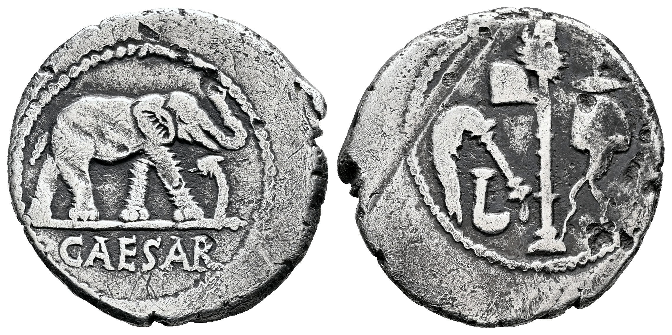 Julius Caesar. Denarius. 54-51 BC. Galia. (Ffc-50). (Craw-443/1). (Cal-640). Anv.: Elephant right, trampling on serpent, CAESAR in exergue. Rev.: Simpulum, sprinkler, axe and priest’s hat. Ag. 3,56 g. Scratch on reverse and minor oxidations. Choice F. Est...300,00.
