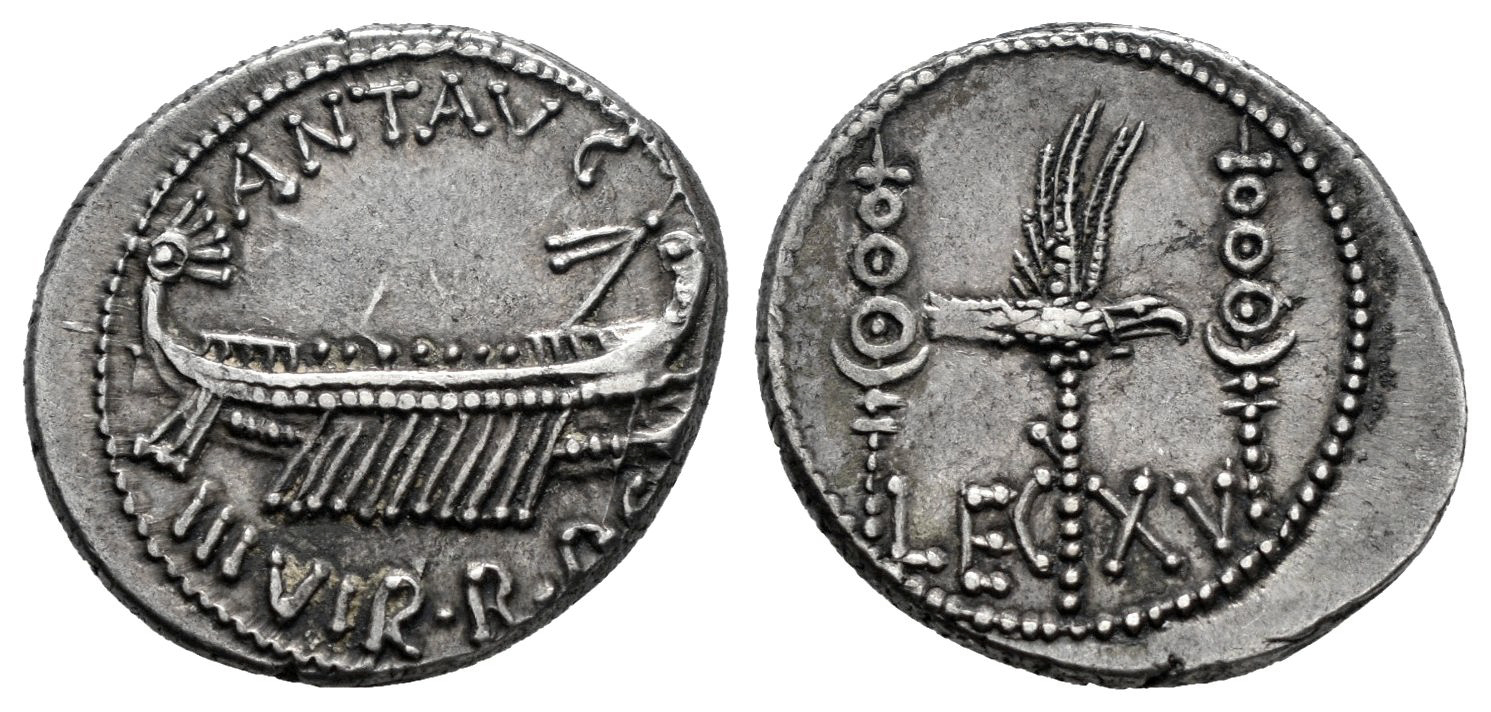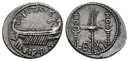 Mark Antony. Denarius. 32-31 BC. Mint moving. (Ffc-50). (Craw-544/30). (Cal-198). Anv.: ANT. AVG. III. VIR. R.P.C. praetorian galley right. Rev.: LEG. XV., legionary eagle between two standards. Ag. 3,81 g. Nice old cabinet tone with slight golden shades. Rare in this condition. XF/Almost XF. Est...600,00.