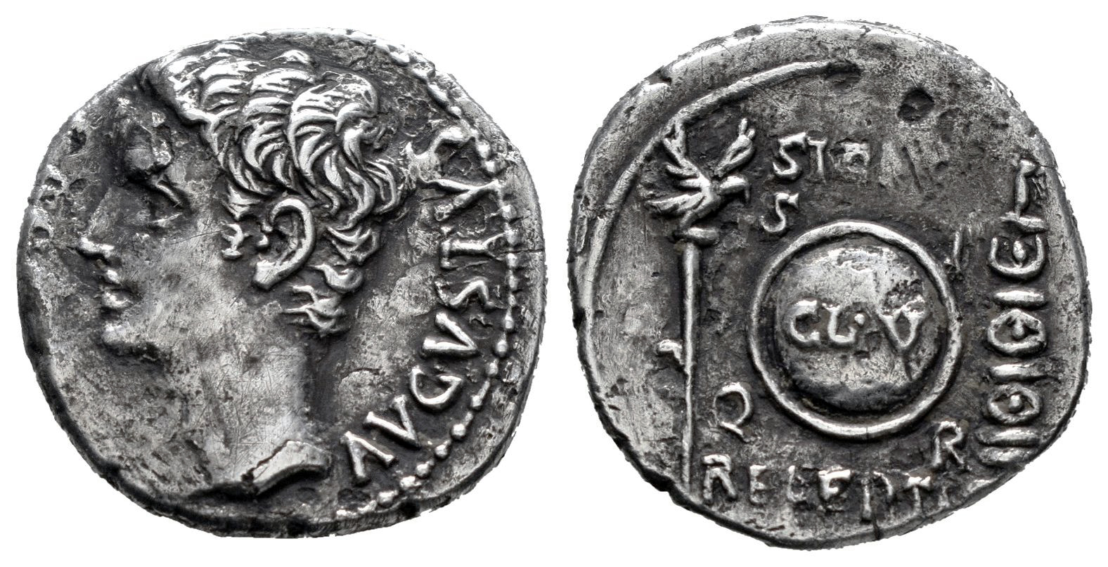 Augustus. Denarius. 19 BC. Colonia Patricia (Córdoba). (Ffc-184). (Ric-86b). (Cal-751). Anv.: CAESAR AVGVSTVS bare head of Augustus left. Rev.: SIGNIS RECEPTIS above and below S.P.Q.R. around shield inscribed CL. V. Roman eagle on Ieft and standard on right. Ag. 3,76 g. Cleaned. Porosities in metal. VF. Est...300,00.