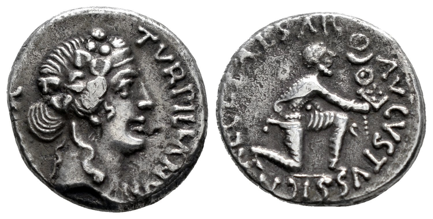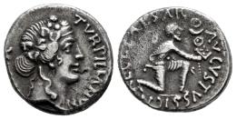 Augustus. P. Petronius Turpilianus. Denarius. 19 BC. Rome. (Ffc-306). (Ric-287). (Cal-1077). Anv.: TVRPILIANVS (III. VI)R., head of Liber or Bacchus right wearing wreath of ivy. Rev.: CAESAR AVGVSTVS SING. RECE., kneeling Parthian right, presenting standard. Ag. 3,68 g. Choice VF. Est...500,00.