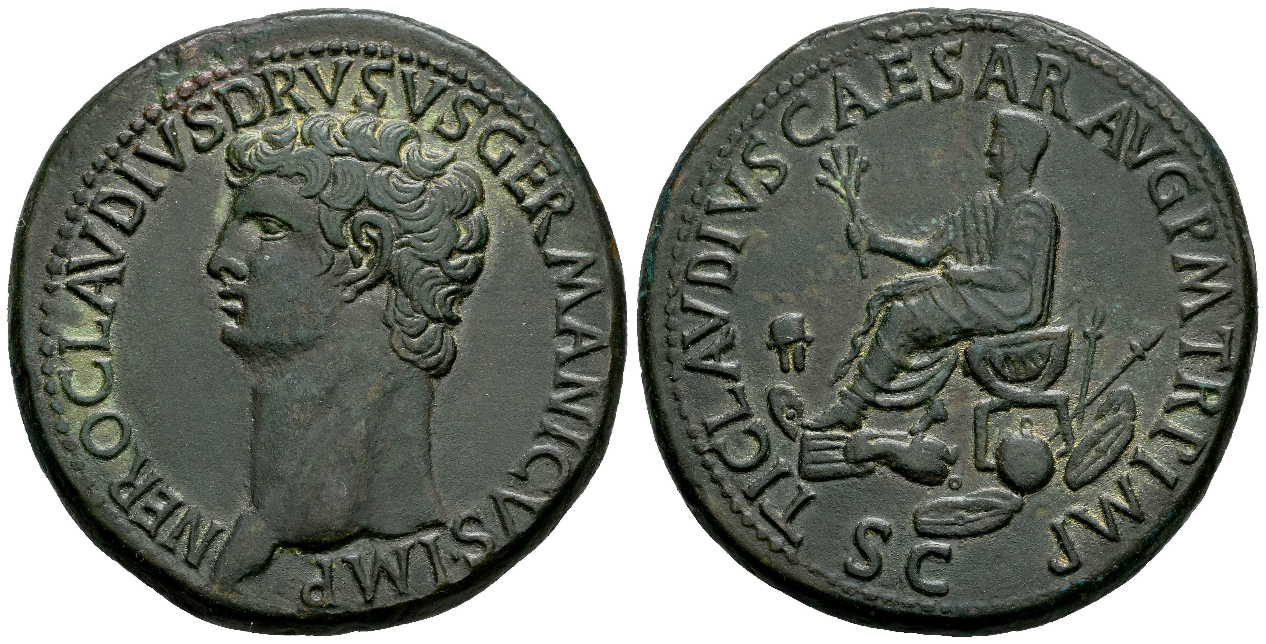 Nero Claudius Drusus. Sestertius. 41-50 AD. Rome. (Ric-I 93). (Bmcre-157). (C-8). Anv.: NERO CLAVDIVS DRVSVS GERMANICVS IMP, bare head to left. Rev.: TI CLAVDIVS CAESAR AVG P M TR P IMP, emperor seated to left on curule chair, holding branch, arms at base; SC below. Ae. 26,39 g. Tooled and smoothed. XF. Est...3200,00.