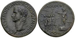 Caligula. Sestertius. 40-41 AD. Rome. (Ric-I 48). (Bmcre-67/8). Anv.: C CAESAR DIVI AVG PRON AVG P M TR P IIII P P, laureate head to left. Rev.: Emperor standing to left with right hand raised on platform, low stool behind, addressing five soldiers holding shields and aquilae; ADLOCVT above, COH in exergue. . 27,39 g. A beautiful and expressive portrait. Slight concretions have been removed and smoothed on the obverse. The reverse is slightly eroded. Nevertheless, this is an attractive example with significant historical significance. The inscription adlocvt coh refers to an Adlocutio Cohortium, a speech given by the emperor to the troops, usually at the start of his reign, when adopting a successor, or before/after a military campaign. Typically, the emperor is shown addressing soldiers from a platform, sometimes with officials nearby. On this coin type, however, Caligula stands alone before a curule chair, saluting. It likely commemorates his address to the Praetorian Guard upon becoming emperor in AD 37, though some link it to his aborted invasion of Britain in AD 40. The issue reflects Caligula’s sharp portrait and highlights the rising power of the Praetorian Guard, which in later decades would dominate imperial successions and cause intense political turmoil. Almost XF/VF. Est...2000,00.