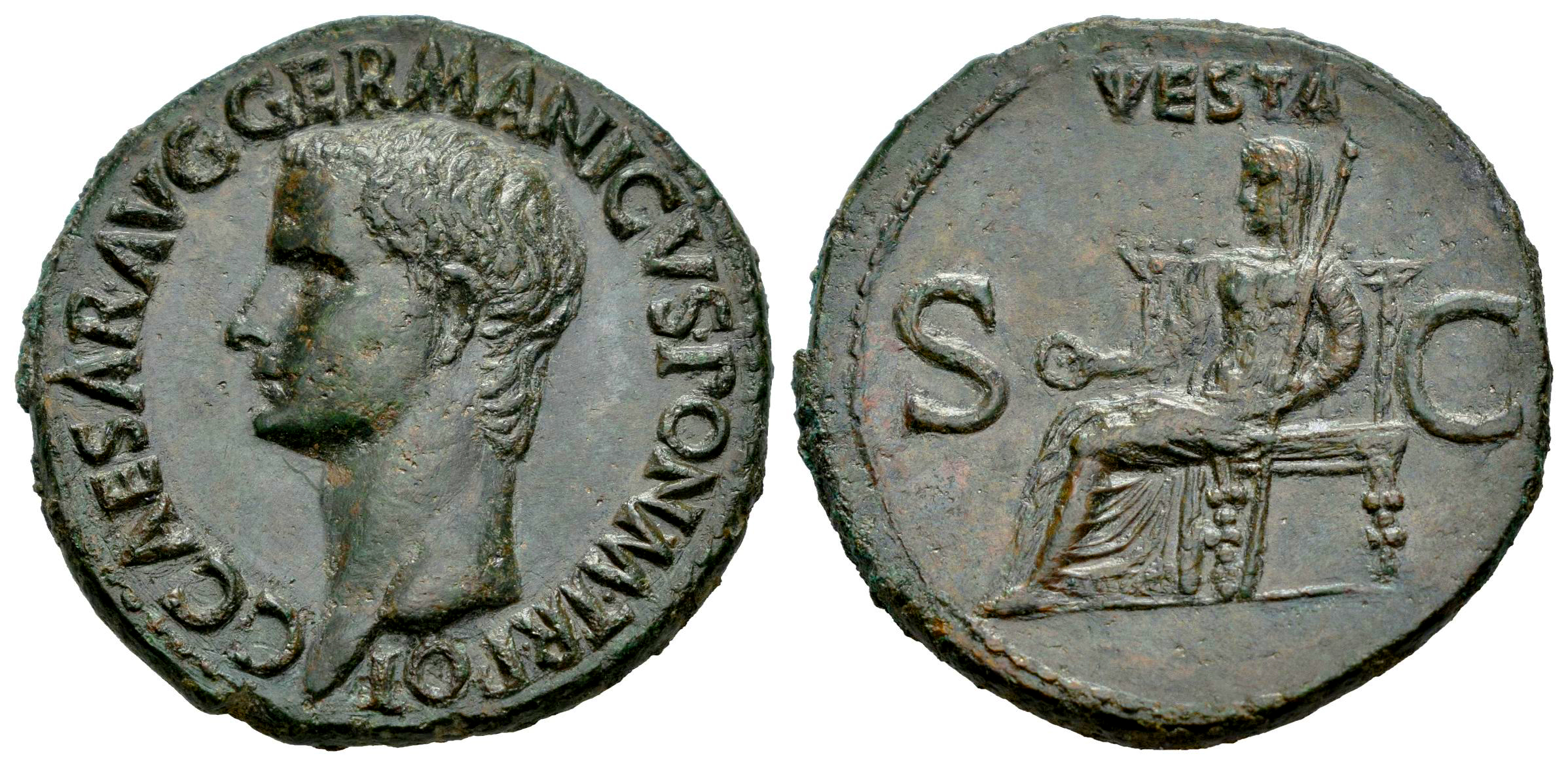 Caligula. Unit. 37-38 AD. Rome. (Ric-I 38). (Bmcre-45/8). (C-27). Anv.: C CAESAR AVG GERMANICVS PON M TR POT, bare head to left. Rev.: Vesta seated to left on ornamented throne, holding patera and sceptre; VESTA above, S-C across fields. Ae. 11,73 g. Slightly smoothed fields. Almost XF. Est...400,00.