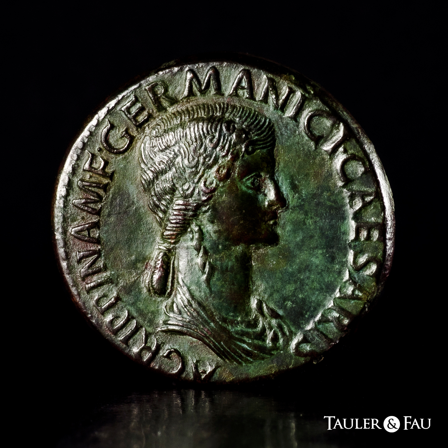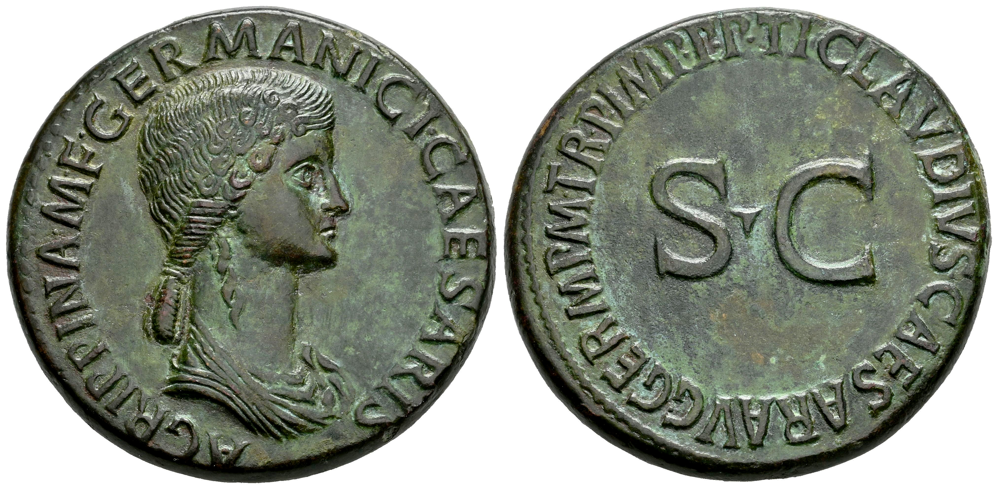 Agrippina I. Sestertius. 42-43 AD. Rome. (Ric-I 102). (Bmcre-219/21). (C-3). Anv.: AGRIPPINA M F GERMANICI CAESARIS, draped bust to right, with hair in long plait. Rev.: TI CLAVDIVS CAESAR AVG GERM P M TR P IMP P P around large S•C.. Ae. 26,04 g. Tooled and smoothed. Ex Gerhard Hirsch 284 (26/09/2012), lot 2697. XF. Est...1000,00.