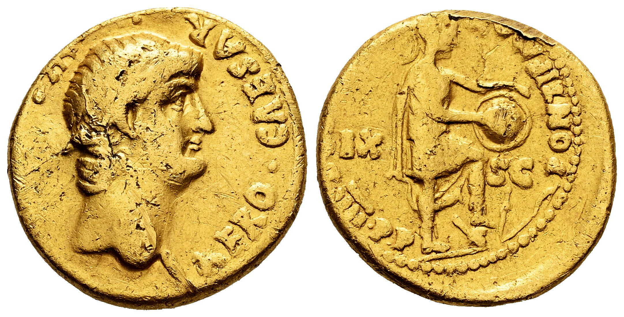 Nero. Aureus. 62-63 AD. Lugdunum. (Ric-I 38?). (Bmcre-43?). (C-230?). Anv.: NERO CAESAR (A)VG (IMP), bare head to right. Rev.: PONTIF MA(X TR P VIIII) COS IIII P P, Roma standing to right, foot on helmet, holding shield, bow and dagger at feet; EX- SC across fields. Au. 7,36 g. Planchet flaw on obverse. Scratches and minor scratches on edge. Scarce. Almost VF. Est...2000,00.