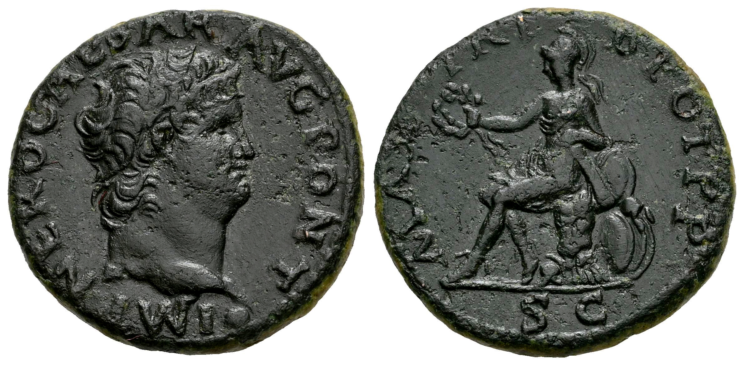 Nero. Half unit. 58-68 AD. Lyon. (Ric-I 555). (WCN-630). Anv.: IMP NERO CAESAR AVG PONT. Bare head of Nero to right, small globe at point of bust. Rev.: MAX TRIB POT P P. Roma seated left on cuirass, holding wreath in her right hand and parazonium in her left; SC in exergue. Ae. 5,08 g. Rare. Choice VF. Est...220,00.