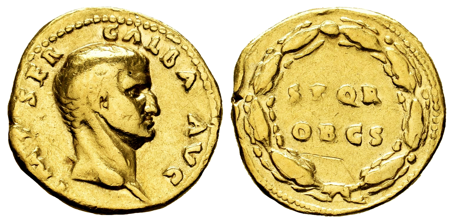Galba. Aureus. July AD 68 - January AD 69. Rome. (Ric-I 164). (Bmcre-29). (Calicó-509a). Anv.: IMP SER GALBA AVG, bare head to right. Rev.: S P Q R OB C S in two lines, all within oak wreath. . 7,21 g. Scratch on reverse. Removed from jewlery. Rare. Whilst Galba was proconsul of Nearer Spain, he became an ally of Vindex, the governor of Gaul, in his revolt against Nero. Following Nero's suicide, Galba marched on Rome and was declared emperor by the Senate at the advanced aged of 70, the first princeps from outside of the Julio-Claudian family. Dio Cassius related that Galba put great emphasis on how the Senate had bestowed power on him, that "he did not adopt the name Caesar until the senate's envoys had come to him... or hitherto even styled himself emperor in any communication." After his accession, Cassius wrote, some citizens "even wore liberty caps, signifying that they had now become free... and voted to Galba the prerogatives pertaining to the imperial office." (Epitome LXIII.29.1)