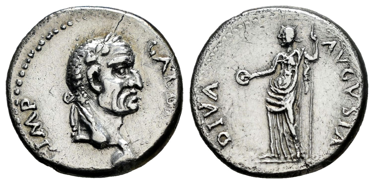 Galba. Denarius. 68 AD. Tarraco. (Ric-14). (Bmcre-167). (Rsc-43). Anv.: IMP GALBA, laureate head right, with globe at point of bust. Rev.: DIVA AVGVSTA, Livia standing left, draped, holding patera and leaning on sceptre. Ag. 3,38 g. Cleaned. Corrosion removed on reverse. Attractive. Almost XF/Choice VF. Est...500,00.