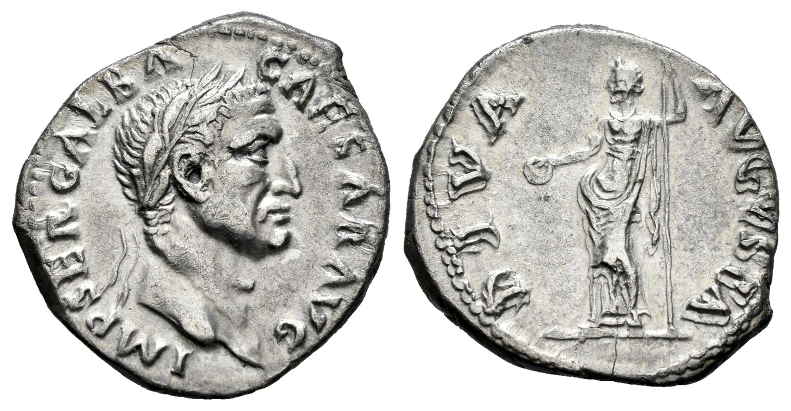 Galba. Denarius. July AD 68 - January AD 69. Rome. (Ric-186). (Bmcre-8/9). (Rsc-55). Anv.: IMP SER GALBA CAESAR AVG, laureate head right. Rev.: DIVA AVGVSTA, Livia standing left, holding patera and sceptre. Ag. 2,96 g. Beautiful and expressive portrait. Thin crack. Scarce. Choice VF. Est...600,00.