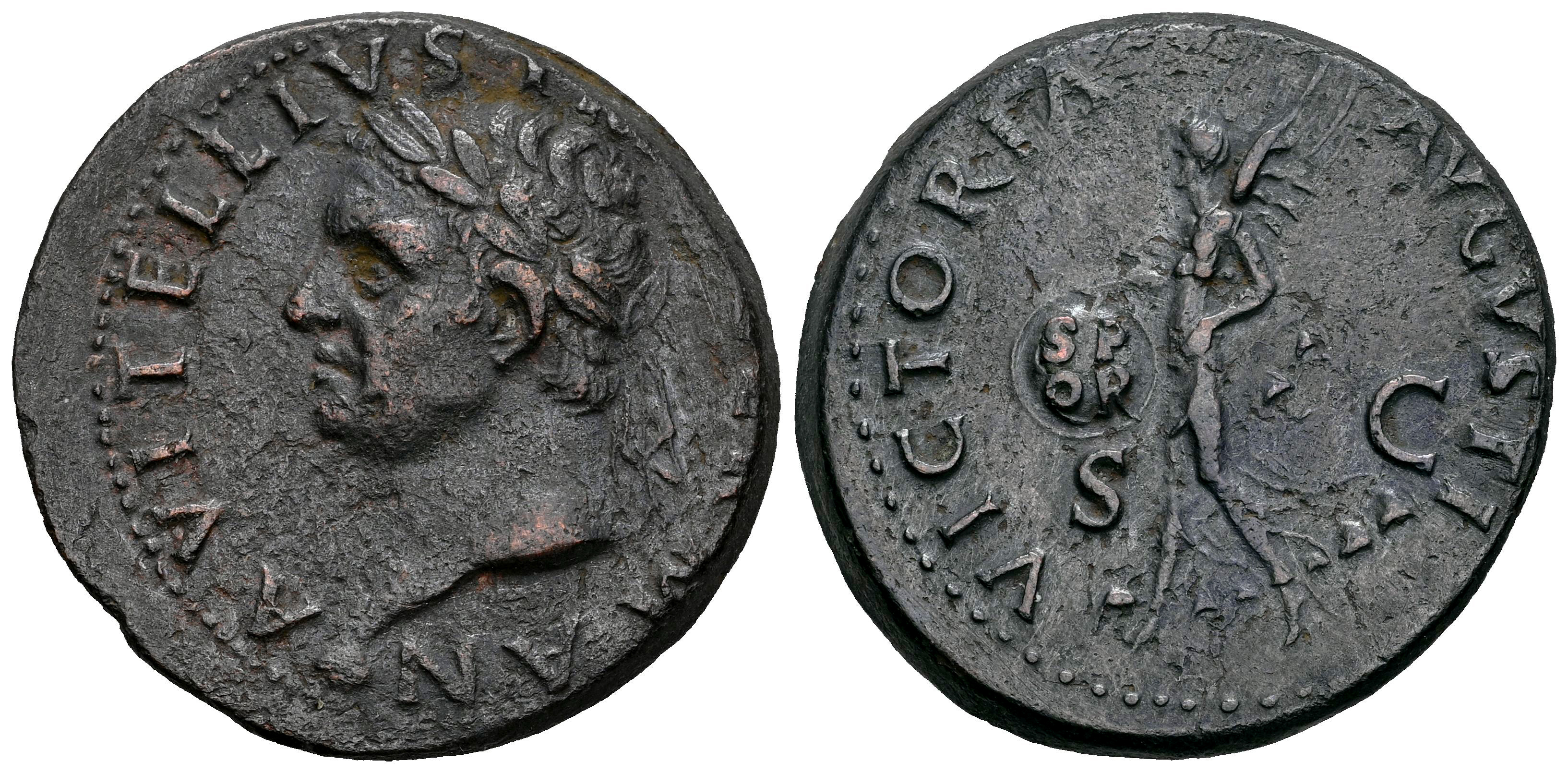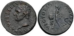 Vitellius. Unit. 69 AD. Tarraco. (Ric-I 46). (Bmcre-107). Anv.: A VITELLIVS (IMP GER)MAN. laureate head to left, globe at point of bust. Rev.: VICTORIA AVGVSTI, Victory advancing to left, holding shield inscribed S P Q R; S-C across fields. Ae. 10,56 g. VF. Est...180,00.