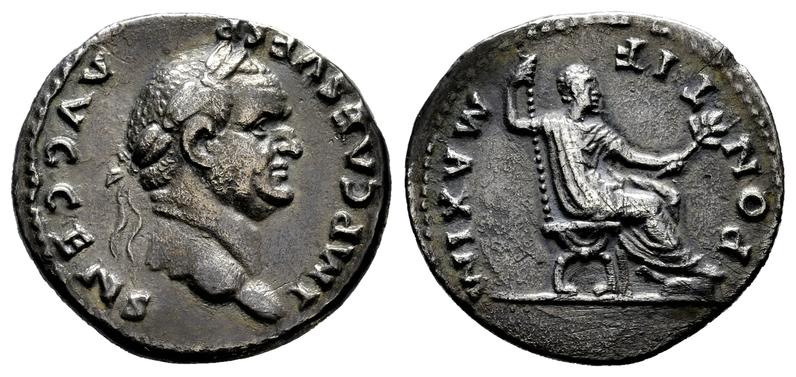 Vespasian. Denarius. 73 AD. Rome. (Ric-545). (Bmcre-p.19 note). (Rsc-387a). Anv.: IMP CAES VESP AVG CEN. Laureate head right. Rev.: PONTIF MAXIM. Vespasian seated to right on curule chair, holding sceptre in right hand and olive branch in left . Ag. 2,81 g. Patina. Scarce. VF. Est...120,00.