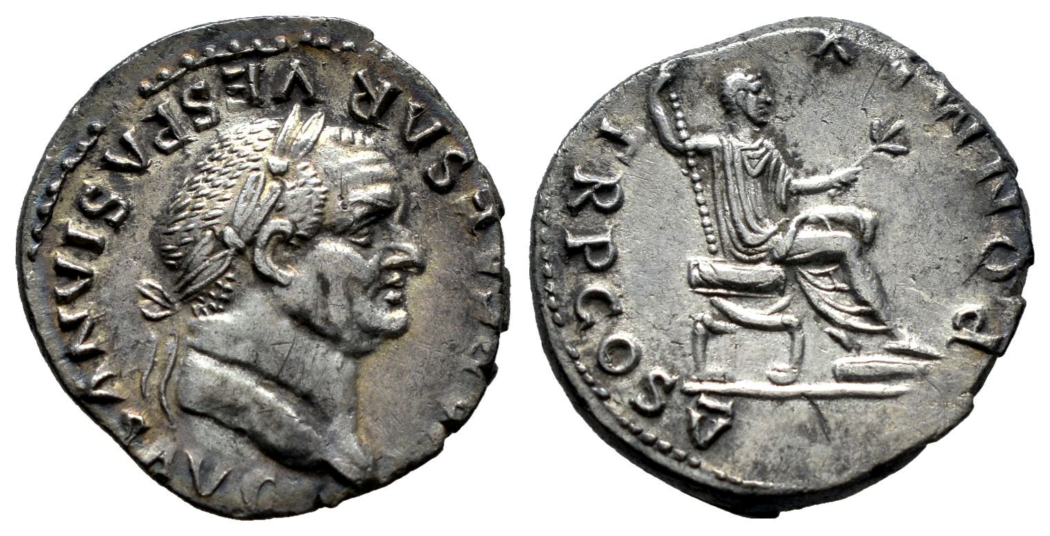 Vespasian. Denarius. 74 d.C. Rome. (Ric-II 1 702). (Bmcre-136). (Rsc-364). Anv.: IMP CAESAR VESPASIANVS AVG. Cabeza laureada a la derecha. Rev.: PON MAX TR P COS V. Emperador sedente a la derecha, sosteniendo cetro y rama. Ag. 3,19 g. Lightly toned. Ex Cgb.fr (23/01/2004), lot 871849. XF. Est...250,00.
