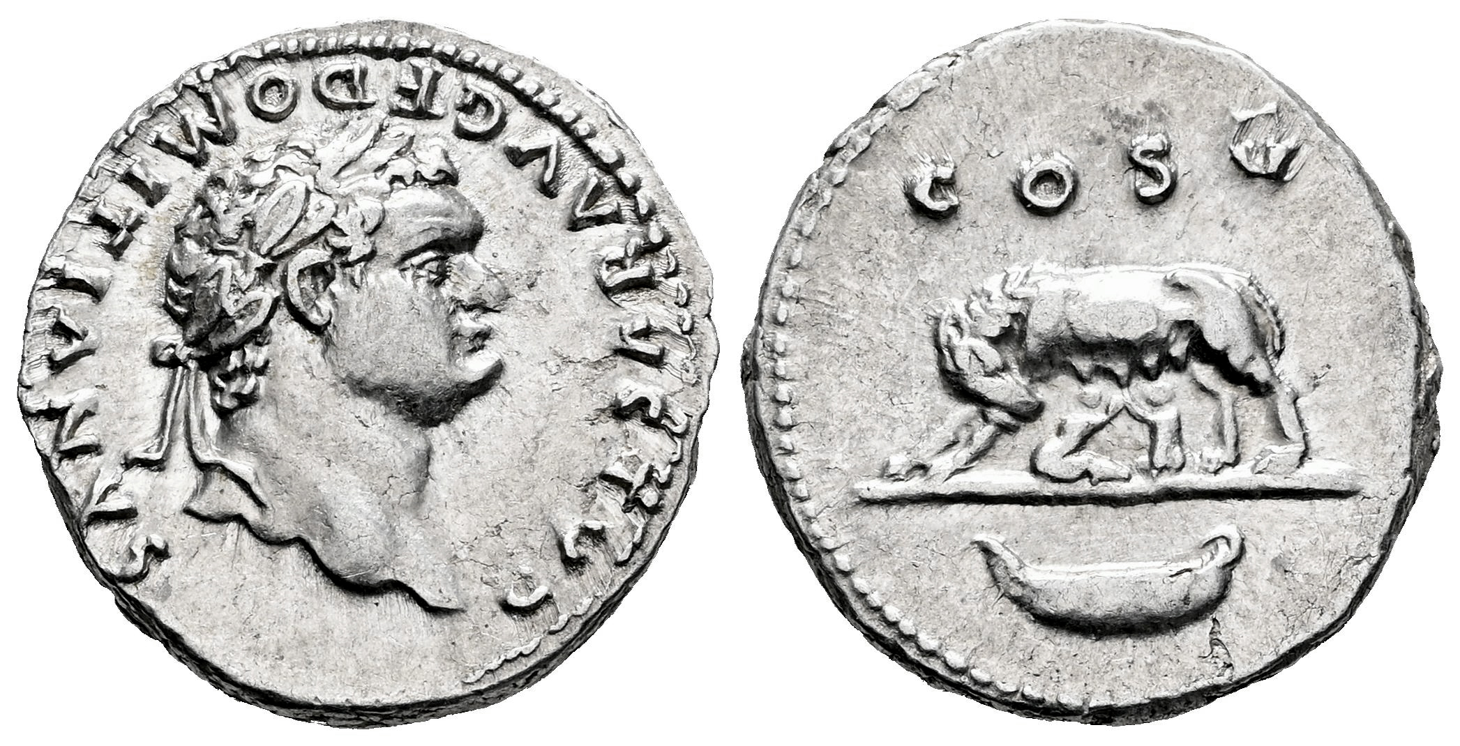Domitian. Denarius. 77-78 AD. Rome. (Ric-II.1 961 (Vespasian)). (Bmcre-241-242 (Vespasian)). (Rsc-51). Anv.: CAESAR AVG F DOMITIANVS, laureate head to right. Rev.: COS V, she-wolf to left, suckling twins; boat in exergue. Ag. 3,49 g. Nice strike with traces of luster. AU. Est...400,00.