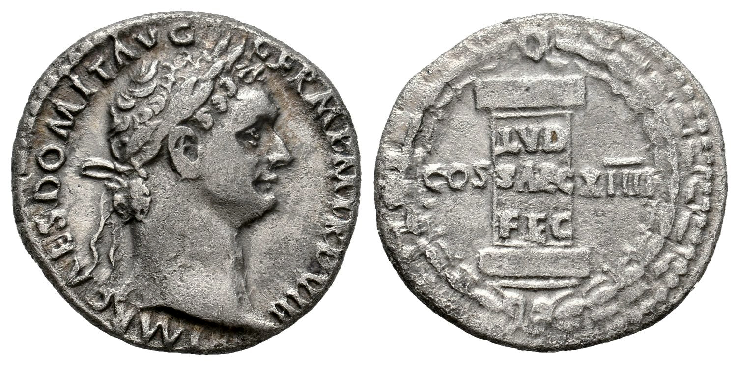 Domitian. Denarius. 88 AD. Rome. (Ric-II. 1 604). (Bmcre-137). (Rsc-70). Anv.: IMP CAES DOMIT AVG GERM P M TR P VIII, laureate head to right. Rev.: Column inscribed LVD SAEC FEC in three lines, within laurel wreath; COS-XIIII across fields. Ag. 3,25 g. Light obverse tone. VF. Est...120,00.