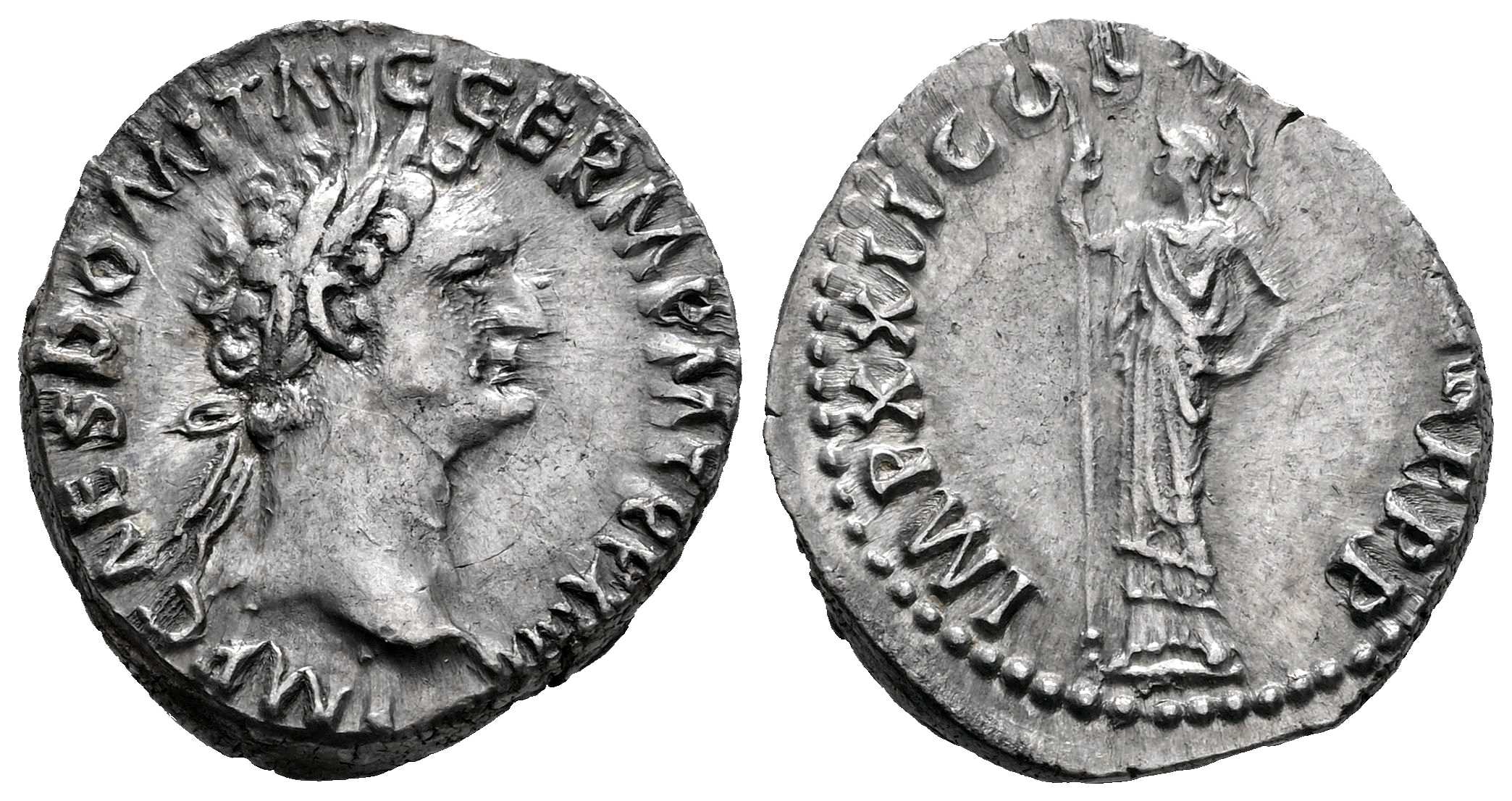 Domitian. Denarius. 88 AD. Rome. (Ric-II 1 773). (Bmcre-226). (Rsc-286). Anv.: IMP CAES DOMIT AVG GERM P M TR P XIIII, laureate head to right. Rev.: IMP XXII COS X(VII CEN)S P P P, Minerva standing to left, holding spear. Ag. 3,65 g. Delicate patina. Choice VF. Est...150,00.