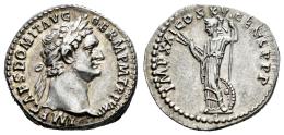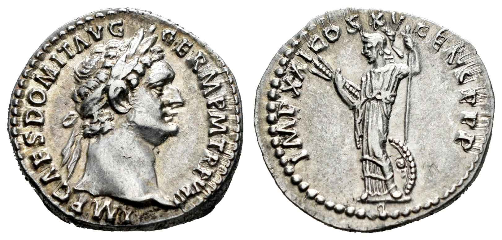 Domitian. Denarius. 90 d.C. Rome. (Ric-II 1 691). (Bmcre-167). (Rsc-260). Anv.: IMP CAES DOMIT AVG GERM P M TR P VIIII, laureate head to right. Rev.: IMP XXI COS XV CENS P P P, Minerva standing facing, head to left, holding thunderbolt in right hand and spear in left, shield at her feet to right. Ag. 3,51 g. A good sample. Traces of luster and lightly toned. Ex H.D. Rauch 118 (25/06/2024), lot 324. XF. Est...400,00.