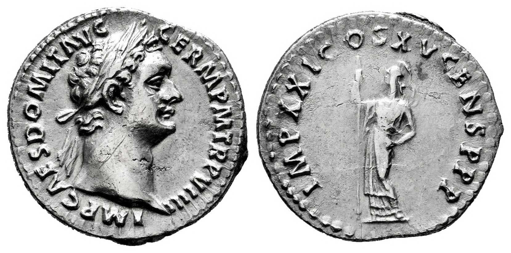 Domitian. Denarius. 90-91 AD. Rome. (Ric-692). (Bmcre-168). (Rsc-259). Anv.: IMP CAES DOMIT AVG GERM P M TR P VIIII. Laureate head right. Rev.: IMP XXI COS XV CENS P P P, Minerva standing left, holding thunderbolt and spear; shield set on ground. Ag. 3,21 g. Choice VF. Est...160,00.