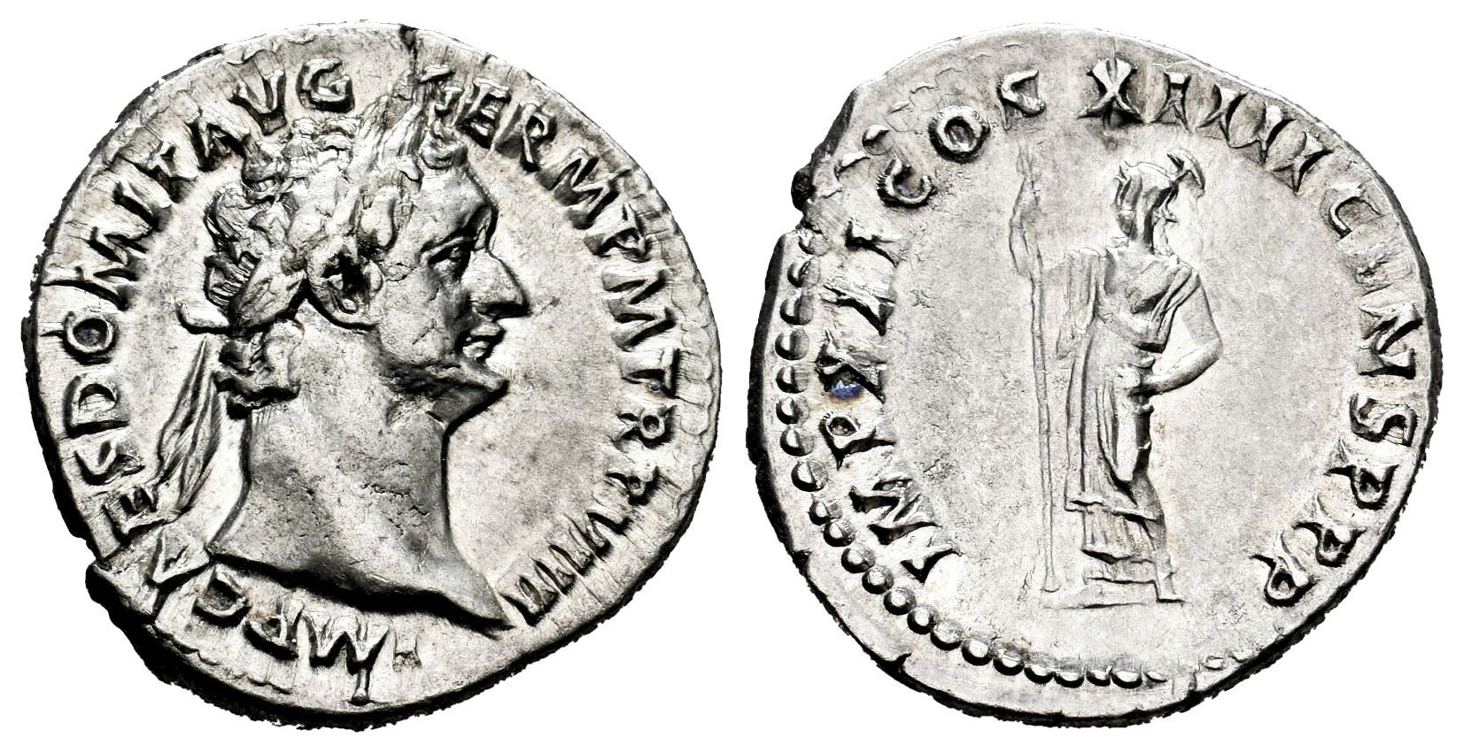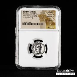 Domitian. Denarius. 88-89 AD. Rome. (Ric-677). Anv.: IMP CAES DOMIT AVG GERM P M TR P VIII, laureate head right. Rev.: IMP XXI COS XIIII CENS P P P, Minerva standing left with spear. Ag. 3,54 g. Original luster. Nice. Scarce in this grade. Slabbed by NGC as Ch XF, Strike 4/5, Surface 4/5, flan flaw. Est...400,00.