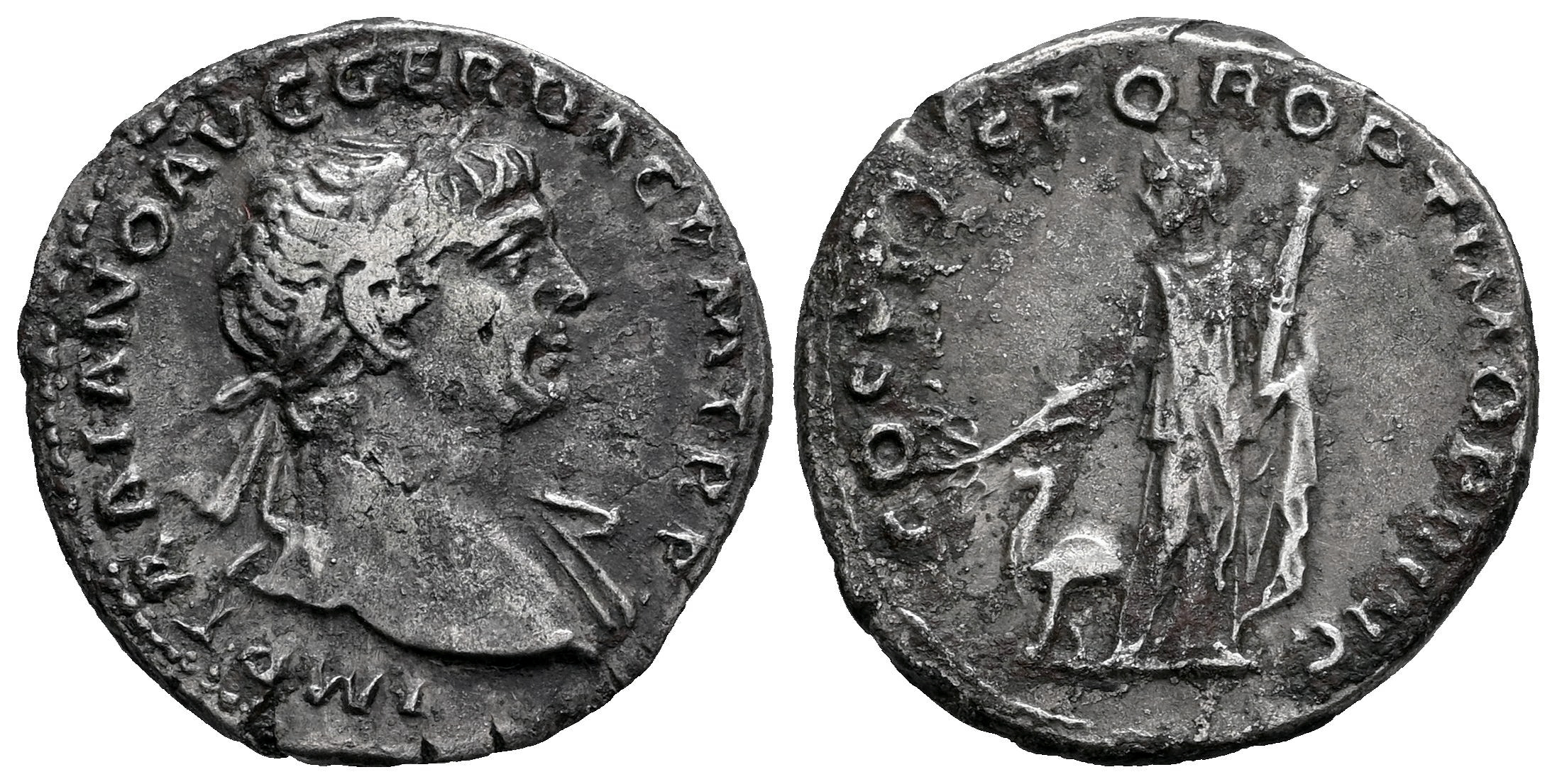 Trajan. Denarius. 110 AD. Rome. (Ric-II 142). (Woytek-285b). (Bmcre-89). Anv.: IMP TRAIANO AVG GER DAC P M TR P, laureate bust to right, slight drapery on far shoulder. Rev.: COS V P P S P Q R OPTIMO PRINC, Arabia standing to left, holding branch and cinnamon sticks?, camel walking to left at feet. Ag. 2,94 g. Patina. Rust. Almost VF/VF. Est...65,00.