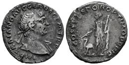 Trajan. Denarius. 110 AD. Rome. (Ric-II 142). (Woytek-285b). (Bmcre-89). Anv.: IMP TRAIANO AVG GER DAC P M TR P, laureate bust to right, slight drapery on far shoulder. Rev.: COS V P P S P Q R OPTIMO PRINC, Arabia standing to left, holding branch and cinnamon sticks?, camel walking to left at feet. Ag. 2,94 g. Patina. Rust. Almost VF/VF. Est...65,00.