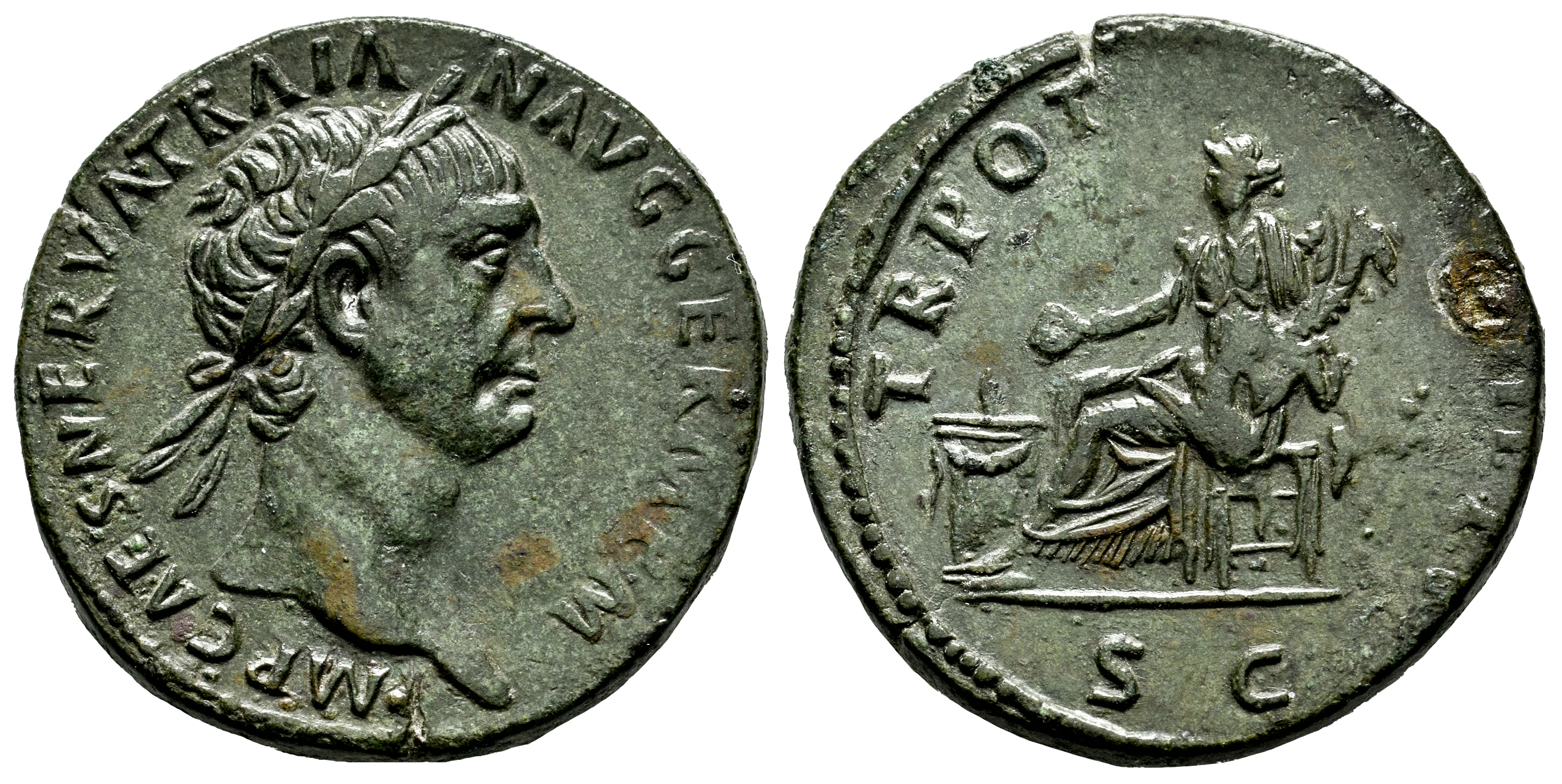 Trajan. Sestertius. 98-117 AD. Rome. (Ric-412). Anv.: IMP CAES NERVA TRAIAN AVG GERM P M. Laureate head right. Rev.: TR POT COS III P P. Concordia seated left on throne, holding patera and double cornucopia; altar to left; SC in exergue. Ae. 25,03 g. Beautiful green patina. Slight rust on reverse. Almost XF/Choice VF. Est...800,00.