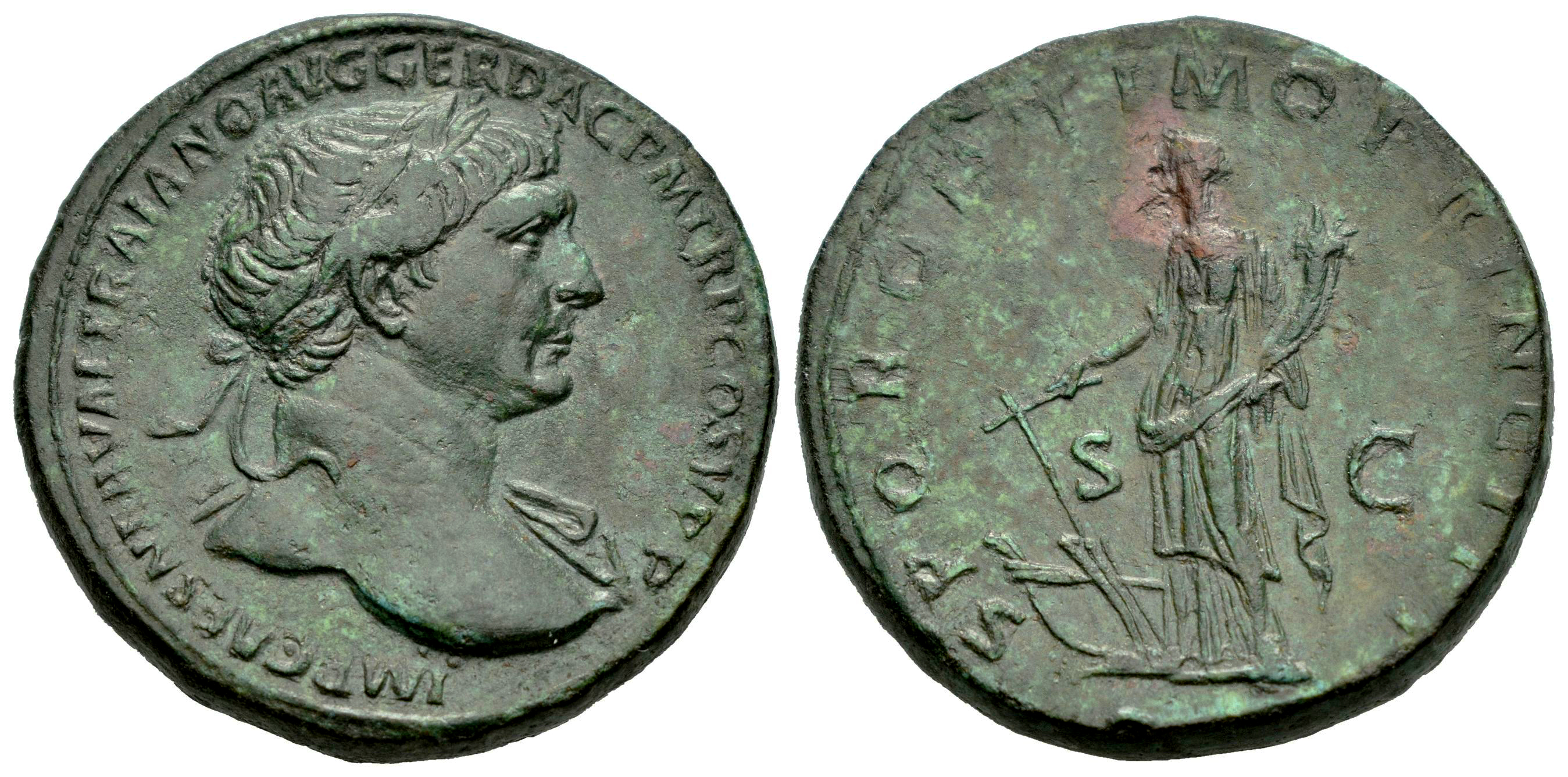Trajan. Sestertius. 108-110 AD. Rome. (Ric-II 500). (Woytek-329b). (Bmcre-797). Anv.: IMP CAES NERVAE TRAIANO AVG GER DAC P M TR P COS V P P, laureate bust to right, drapery over left shoulder. Rev.: S P Q R OPTIMO PRINCIPI, Fortuna standing to left, holding cornucopiae and rudder resting on prow; S-C across fields. Ae. 28,05 g. Attractive specimen. Beautiful green patina. Almost XF. Est...1000,00.