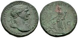Trajan. Sestertius. 108-110 AD. Rome. (Ric-II 500). (Woytek-329b). (Bmcre-797). Anv.: IMP CAES NERVAE TRAIANO AVG GER DAC P M TR P COS V P P, laureate bust to right, drapery over left shoulder. Rev.: S P Q R OPTIMO PRINCIPI, Fortuna standing to left, holding cornucopiae and rudder resting on prow; S-C across fields. Ae. 28,05 g. Attractive specimen. Beautiful green patina. Almost XF. Est...1000,00.