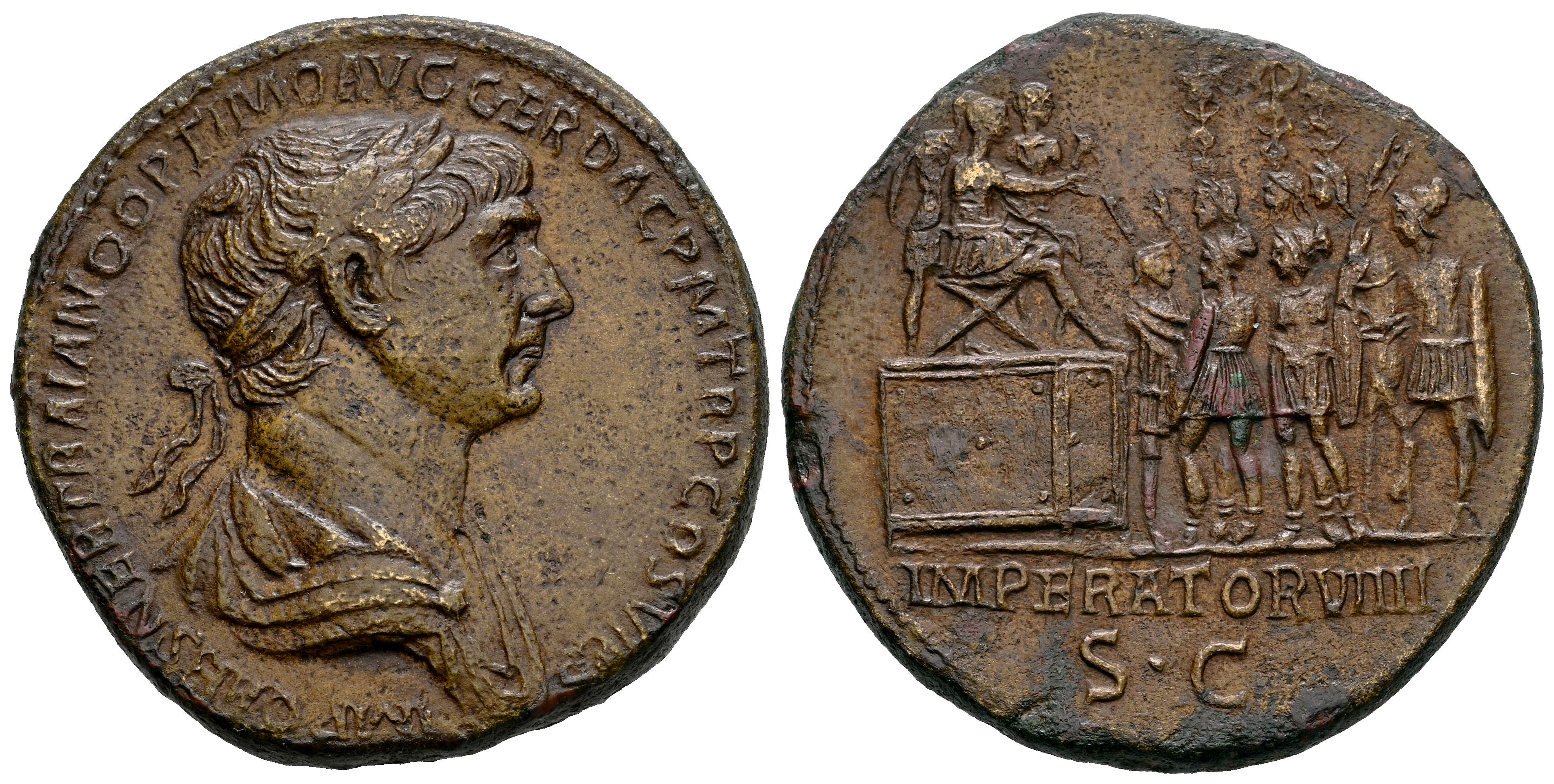 Trajan. Sestertius. 114-117 AD. Rome. (Ric-658). (Bmcre-1017). (Banti-80). Anv.: IMP CAES NER TRAIANO OPTIMO AVG GER DAC P M TR P COS VI P P, laureate and draped bust right. Rev.: Trajan seated on platform right, addressing soldiers accompanied by two officers; IMPERATOR VIIII below; S C in exergue. Ae. 21,53 g. Beautiful brown patina. Ex Numismatik Lanz 150 (13/12/2010), lot 287. Choice VF/Almost XF. Est...1000,00.