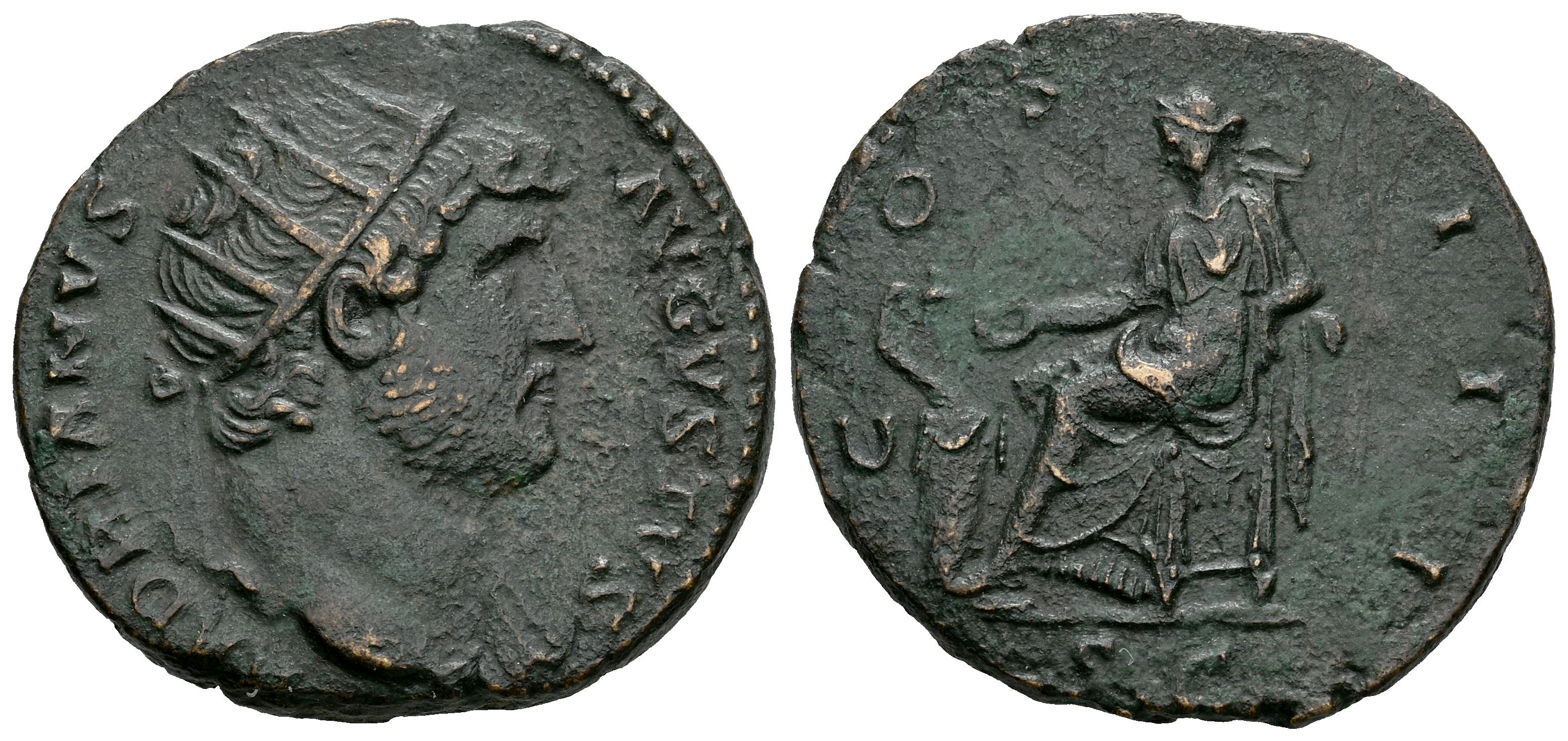 Hadrian. Dupondius. 124-127 AD. Rome. (Ric-II 3 877). (Bmcre-1326). Anv.: HADRIANVS AVGVSTVS, radiate head to right, drapery on far shoulder. Rev.: COS III, Salus seated to left, feeding snake rising from altar with patera; SC in exergue. Ae. 9,95 g. Ex Roma Numismatics (21/05/2013), lote 1419. VF. Est...75,00.