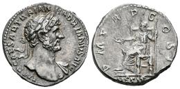 Hadrian. Denarius. 118 AD. Rome. (Ric-II 3, 117). (Bmcre-74). (Rsc-877). Anv.: IMP CAESAR TRAIAN HADRIANVS AVG, laureate bust to right, with slight drapery on far shoulder. Rev.: P M TR P COS II, Justitia seated to left, holding patera and sceptre; (I)VSTIT(IA) in exergue. Ag. 3,49 g. Ex Soler & Llach (14/07/2009), lot 2347. Choice VF/VF. Est...120,00.