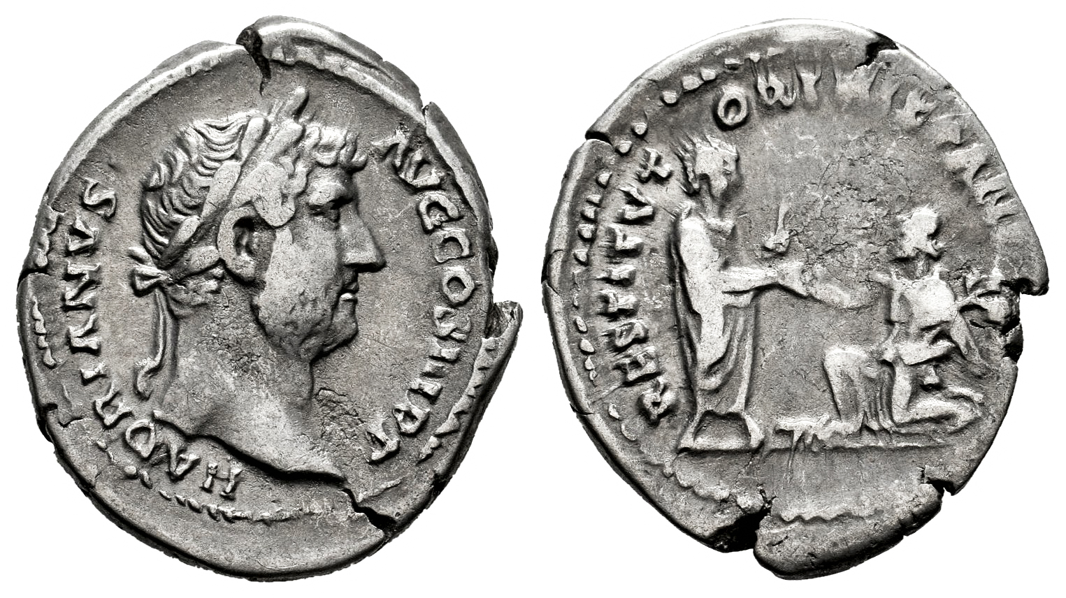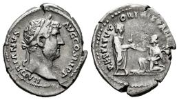 Hadrian. Denarius. 130-133 AD. Rome. (Ric-1584). (Cohen-1270). Anv.: HADRIANVS AVG COS III P P Laureate head to right. Rev.: RESTITVTORI HISPANIAE Hadrian, togate, standing right, holding scroll in his left hand and raising up Hispania, who kneels to left before him and holds an olive branch in her left hand. Ag. 3,44 g. VF/Almost VF. Est...150,00.