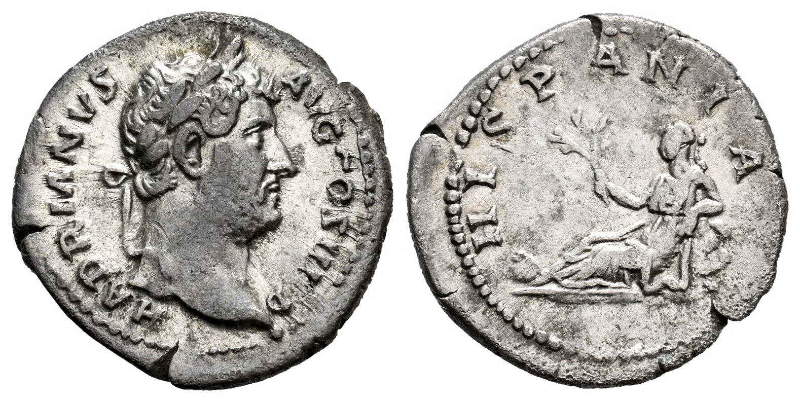 Hadrian. Denarius. 134-138 AD. Rome. (Ric-306). (Rsc-834). Anv.: HADRIANVS AVG COS III PP, laureate head right. Rev.: HISPANIA, Hispania reclining left, holding branch and resting arm on rock, in front of her a rabbit. Ag. 3,27 g. Well-centerd struck. Rare. Choice VF. Est...500,00.