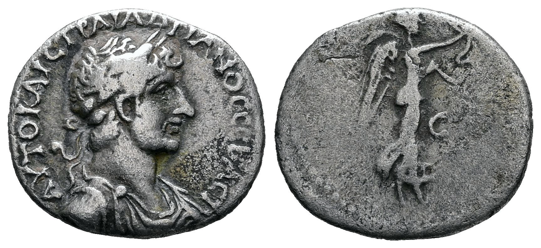 Hadrian. Hemidrachm. RY 4/5 = 119/21 AD. Caesarea. Cappadocia. (RPC-II 3075/6). (Sydenham-Caesarea 256/260). Anv.: ΑΥΤΟ ΚΑΙϹ ΤΡΑΙ ΑΔΡΙΑΝΟϹ ϹΕΒΑϹΤ, laureate, draped and cuirassed bust to right. Rev.: Nike advancing to right, holding wreath and palm; Є(T Є or  Δ) in right field. Ag. 1,51 g. Lightly toned. VF/Almost VF. Est...50,00.
