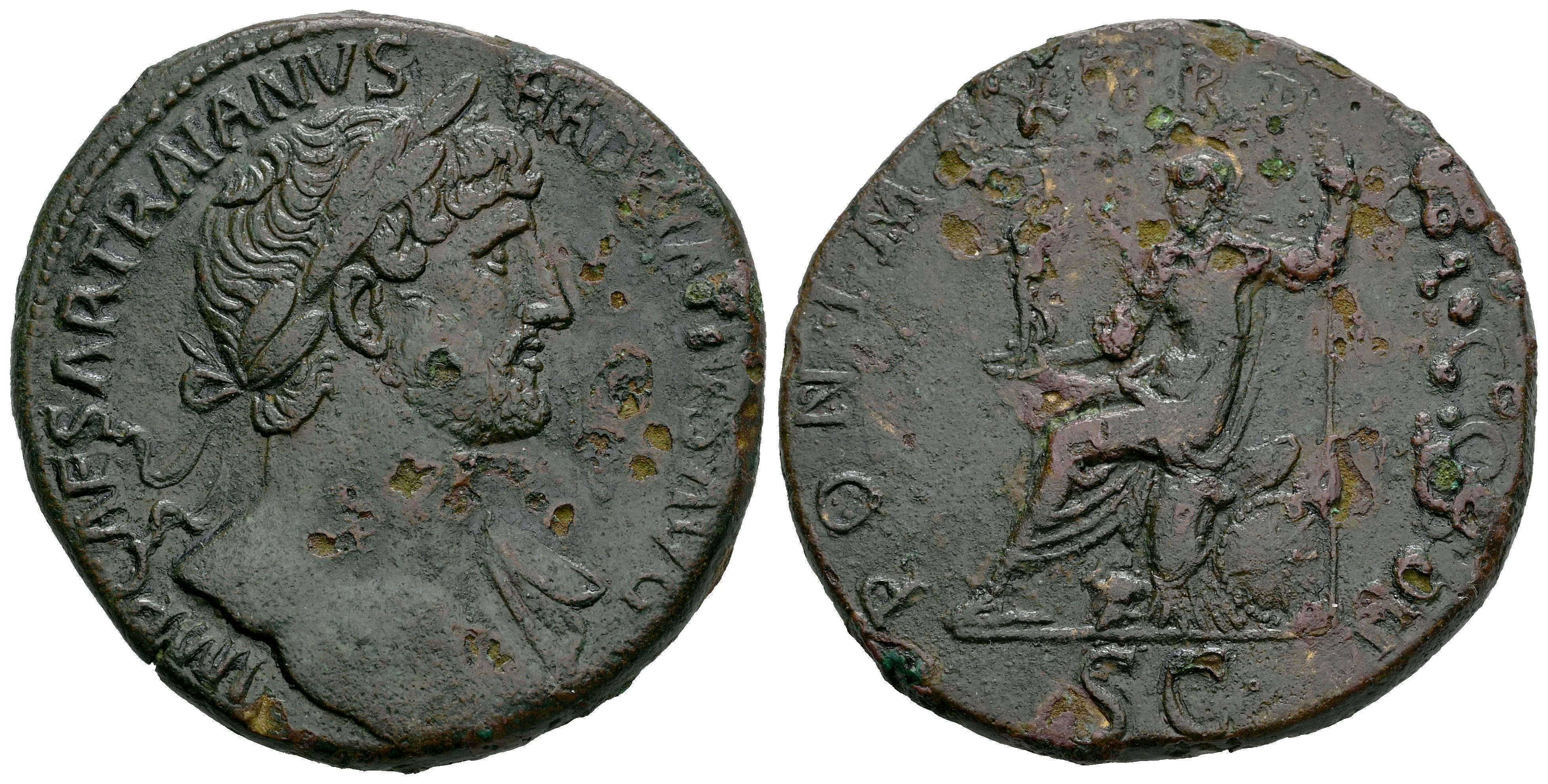 Hadrian. Sestertius. 119-120 AD. Rome. (Ric-II 3 249). (Bmcre-1146). (C-1184 var.). Anv.: IMP CAESAR TRAIANVS HADRIANVS AVG, laureate heroic bust to right. Rev.: PONT MAX TR POT COS III, Jupiter seated to left, holding Victory and sceptre; S C in exergue. Ae. 22,21 g. Green patina. Rust. Choice VF/VF. Est...200,00.