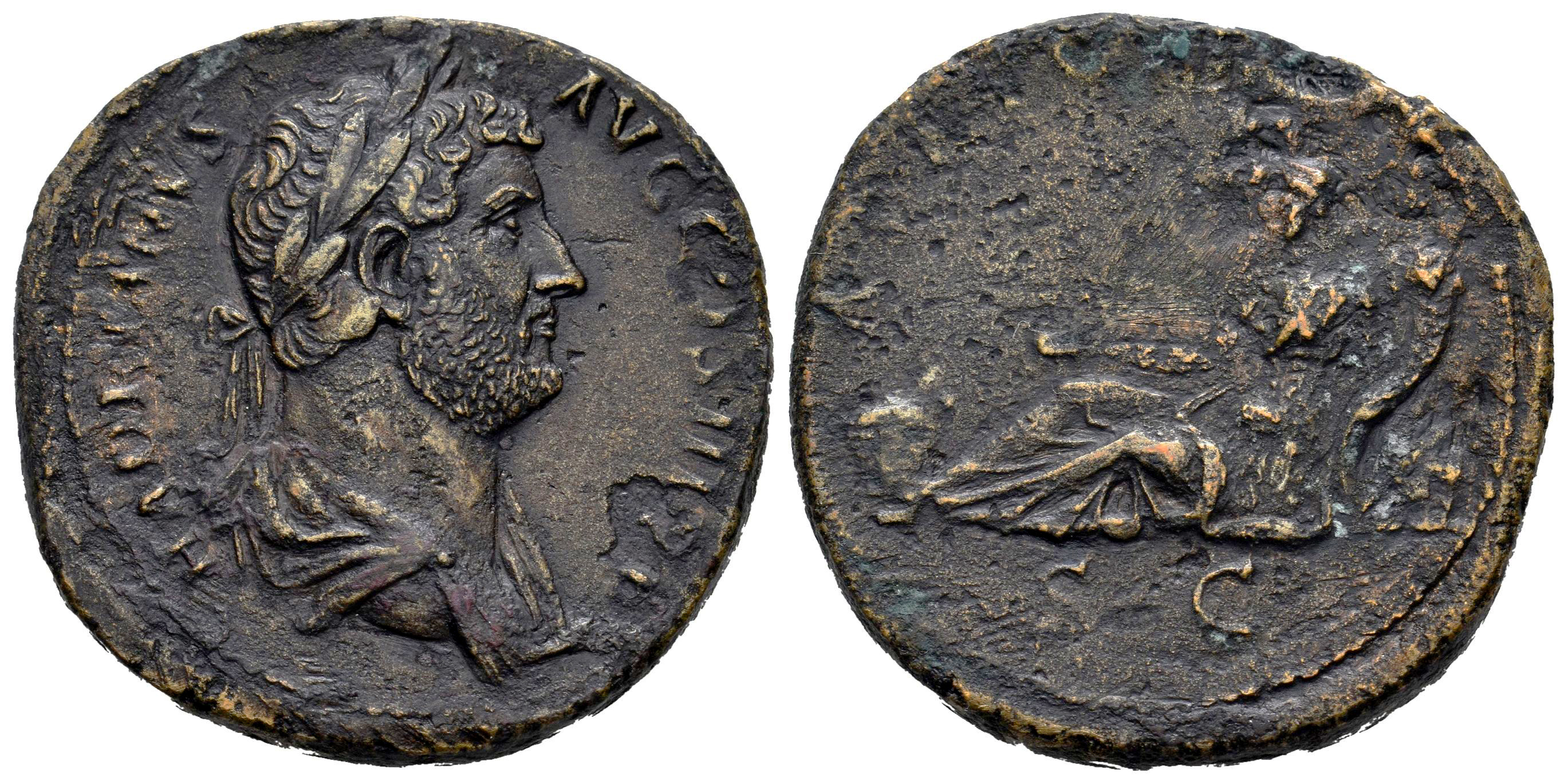 Hadrian. Sestertius. 130-133 AD. Rome. (Ric-II 3, 1609). (Bmcre-1709). Anv.: HADRIANVS AVG COS III P P, laureate and draped bust right. Rev.: AFRICA, Africa, draped and wearing elephant-skin headdress, reclining left on a rock, holding scorpio and cornucopia; to left, basket of grain ear. Ae. 24,48 g. Beautiful portrait. Hairlines and rust on reverse. Choice VF/Choice F. Est...200,00.