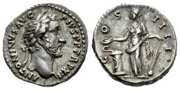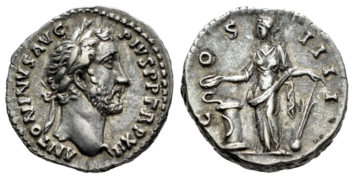 Antoninus Pius. Denarius. 148-149 AD. Rome. (Ric-III 181). (Bmcre-670). (Rsc-281). Anv.: ANTONINVS AVG PIVS P P TR P XII, laureate head to right. Rev.: COS IIII, Salus standing to left, holding patera and rudder on globe, feeding serpent entwined around altar to left. Ag. 3,63 g. Ex Noonans, M.J. Roberts Collection (18/07/2023), lot 1506. XF. Est...120,00.