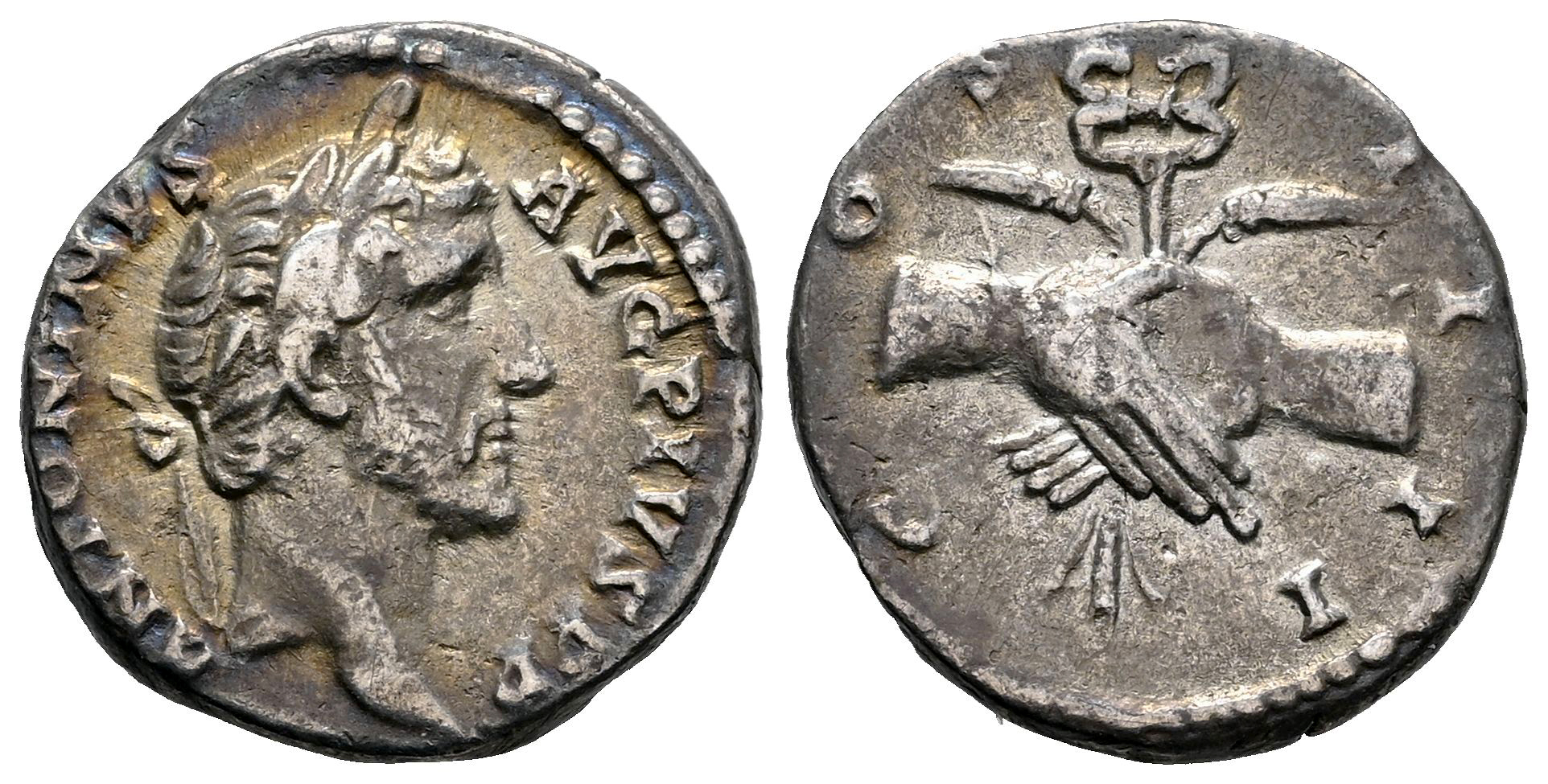 Antoninus Pius. Denarius. 145-161 AD. Rome. (Ric-III 136). (Bmcre-530). (Rsc-344). Anv.: ANTONINVS AVG PIVS P P, laureate head to right. Rev.: COS IIII, clasped hands holding caduceus between two corn-ears. Ag. 3,22 g. Lightly toned. Almost VF. Est...75,00.