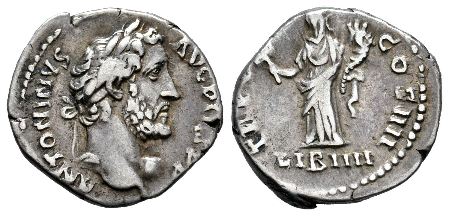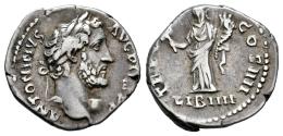Antoninus Pius. Denarius. 145-161 AD. Rome. (Ric-III 155). (Bmcre-567/8). (Rsc-490a). Anv.: ANTONINVS AVG PIVS P P, laureate head to right. Rev.: TR P(OT) COS IIII, Liberalitas standing facing, head to left, holding abacus and cornucopiae; LIB IIII in exergue . Ag. 3,34 g. Choice VF/VF. Est...90,00.