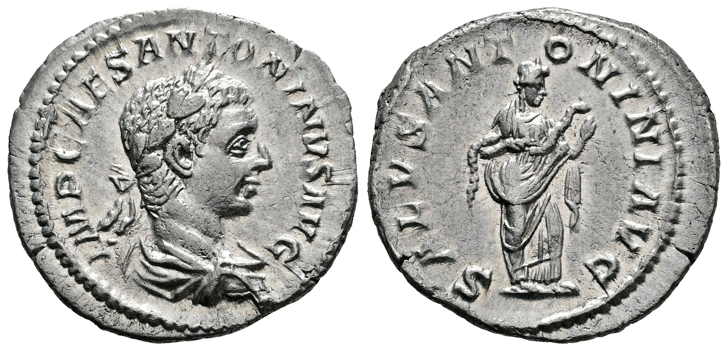 Elagabalus. Denarius. 218-219 AD. Rome. (Ric-IV 139). (Bmcre-120). (Rsc-261a). Anv.: IMP CAES ANTONINVS AVG, laureate, draped and cuirassed bust to right. Rev.: SALVS ANTONINI AVG, Salus standing facing, head to right, feeding snake held in her arms. Ag. 3,20 g. Ex Áureo & Calicó 219/2 (02/07/2009), lot 2305. Almost XF. Est...110,00.